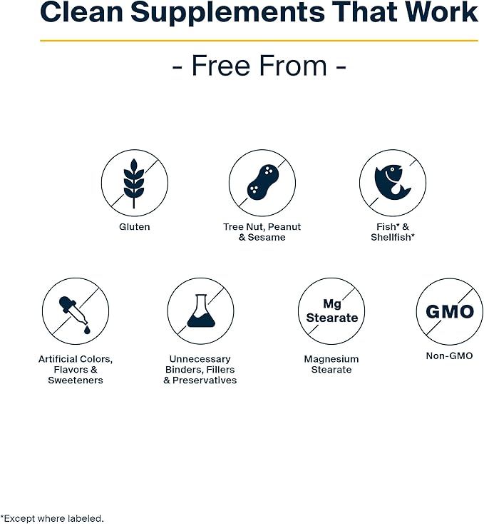 - Clean Formula: Free from gluten, dairy, peanut, tree nut, fish, shellfish, sesame, and egg Non-GMO Made without artificial fillers, coatings, binders, or colors