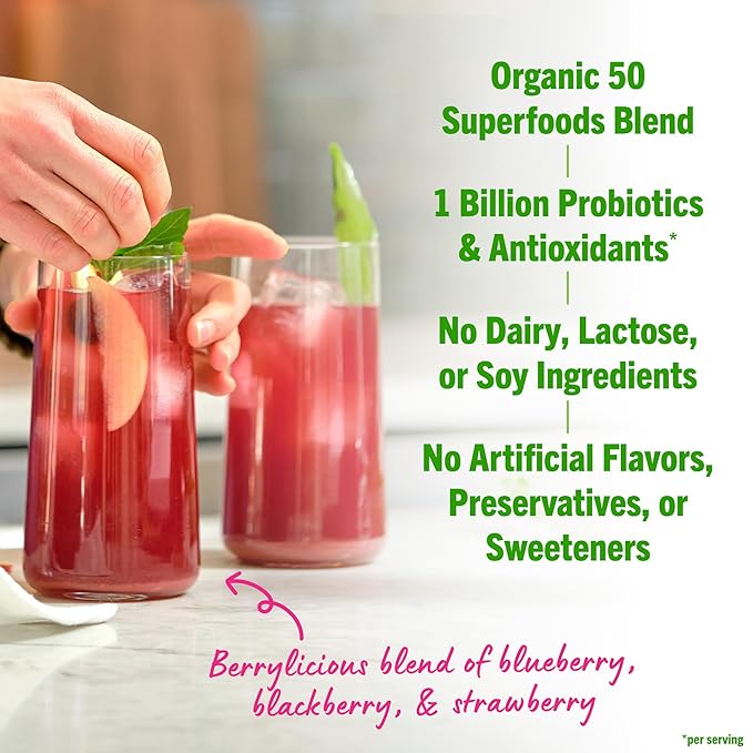 - CLEANER INGREDIENTS: Our Organic Superfoods Powder is packed with nutrients & antioxidants from 50 plant-based superfood ingredients such as organic ancient grains, berries, fruits, greens, grasses, veggies, herbs and sprouts. It also features 1 billion probiotics & 6g of Fiber per serving to support digestive and gut health!