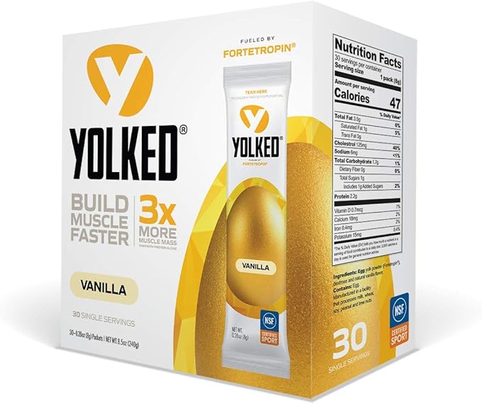 - BUILT FOR THE GYM: Each box of YOLKED Supplement contains 30 individual pouches of vanilla flavored Fortetropin, so you get a month of pocket-sized powder ready for your gym bag.