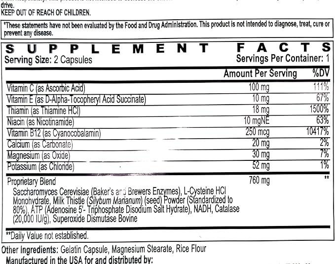 - Special Ingredients : L-Cysteine, NADH, Silmarin, Saccharomyes Cervlslae yeast, Milk Thistle, catalase.