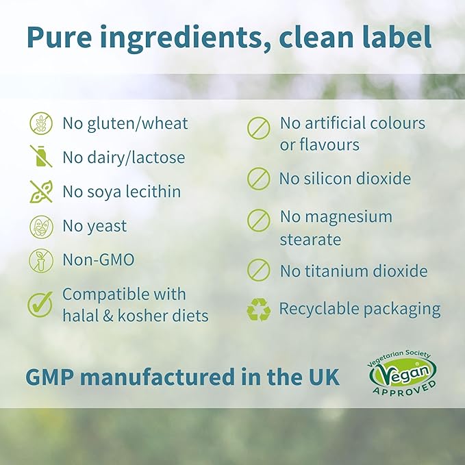 - PURE & CLEAN: vegan; non-GMO; hypoallergenic ingredients with no unpleasant fillers (silicon dioxide, magnesium stearate or titanium dioxide); natural taste with no added flavors. Lab verified, GMP manufactured in the UK