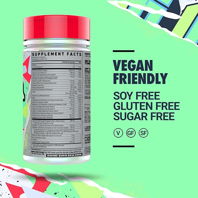 - Fully Loaded Multivitamin: GHOST Multi comes loaded with highly bioavailable forms of 21 Vitamins & Minerals, plus Lutemax 2020 for blue light support…AND it’s vegan-friendly.* Get ready to add this to your daily routine. Serving size 3 capsules, 30 servings per container.