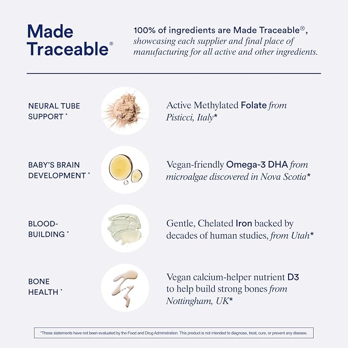 - MADE TRACEABLE: Our world-class scientists scoured the globe for high quality ingredients when formulating Essential for Women Prenatal Multivitamin. Our formula includes active, methylated Folate from Italy - for brain support, Omega-3 DHA from microalgae discovered in Nova Scotia - for heart support, Choline from Missouri, made using nature-identical tartaric acid - for brain support, and gentle, chelated Iron backed by decades of human studies, from Utah - for blood-building support.*