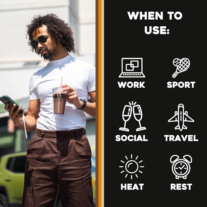 - ON THE GO - HALO’s electrolyte energy powder is perfect for on-the-go hydration. Avoid chronic dehydration from daily activities such as working out, sports, cycling, late nights, work, travel, or to boost your afternoon slump. Whether you are an athlete or a wellness enthusiast, these hydration gym powdered packets are for you.