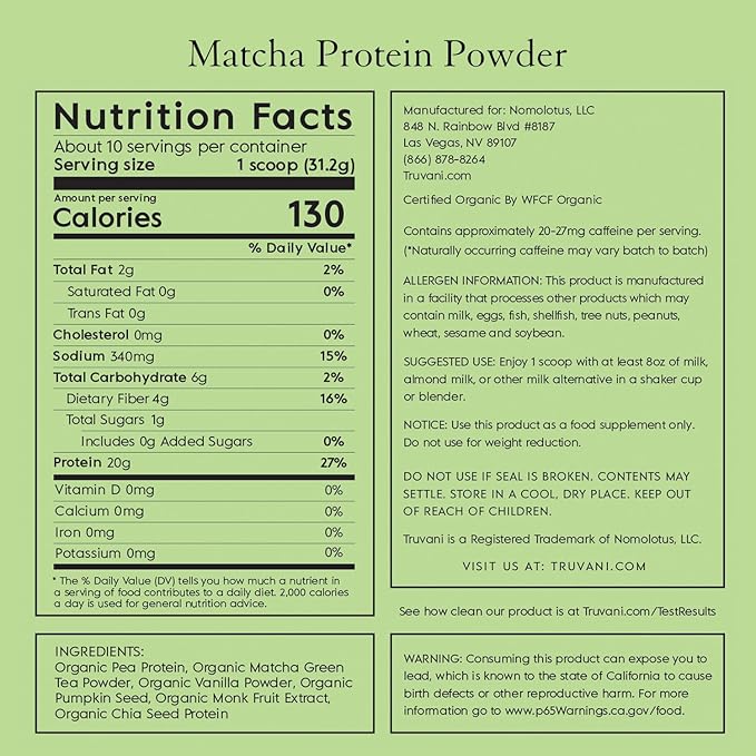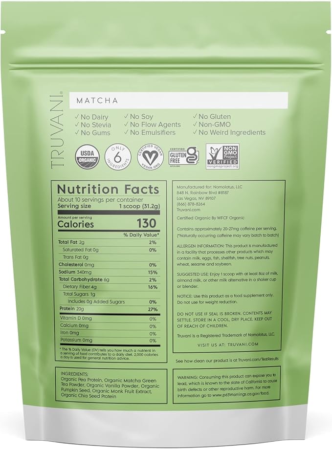 Truvani Vegan Pea Protein Powder | Matcha | 20g Organic Plant Based Protein | 10 Servings | Keto | Gluten & Dairy Free | Low Carb | No Added Sugar