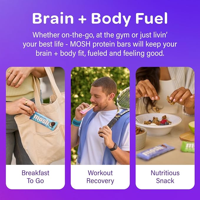 - MIND-BLOWING INGREDIENTS - MOSH clean protein bars are loaded with brain-enhancing nutrients like lion’s mane, ashwagandha, omega 3's, flaxseed, vitamin B12, and D3. Using a science-backed formulation called Cognizin, we provide nutritious and tasty bars for an active and busy lifestyle. They are perfect as a healthy midday snack for kids or a great addition to a college care package.