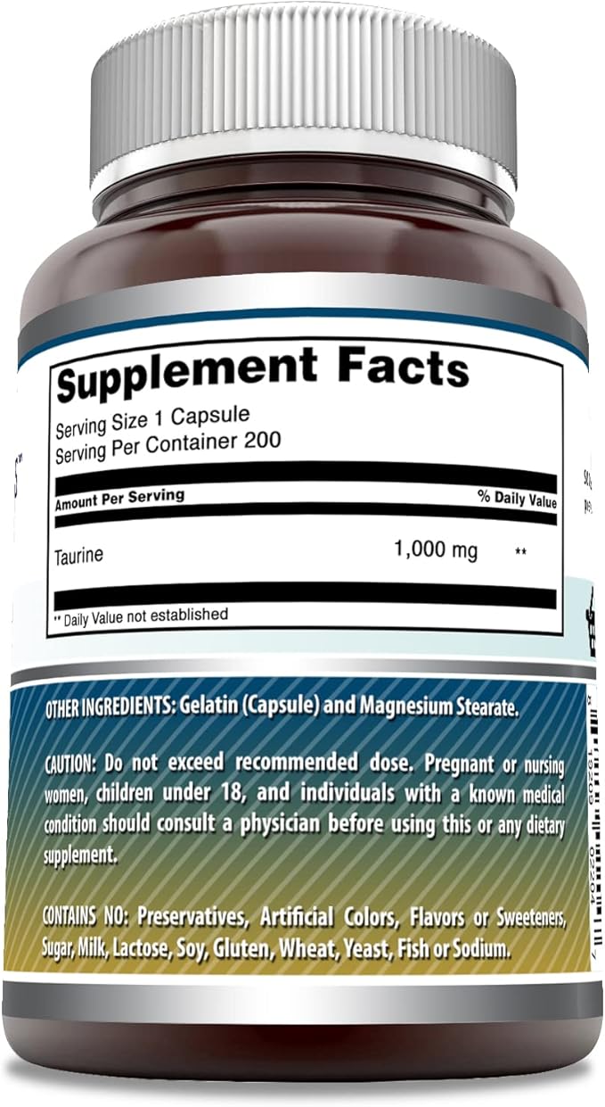 Amazing Formulas Taurine 1000 Mg per Serving 200 Capsules Amino Acid Supplement | Non-GMO | Gluten Free | Made in USA