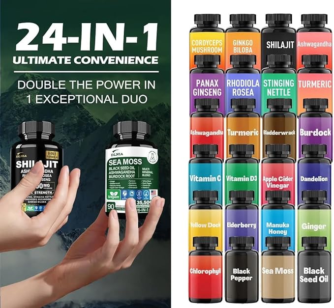 - Complete & Streamline Wellness Routine: DLNIA's Himalayan Shilajit & Seamoss formulas offer diverse benefits. Combining the mineral-rich benefits of Shilajit, Sea Moss, Black Seed Oil, Ashwagandha, Ginger, Rhodiola Rosea, Panax Ginseng, Turmeric, and Ginkgo, this streamlined duo provides continuous support for your overall well-being, making it easy to stay on top of your health game. Tailored for both men and women, this bundle offers a comprehensive solution for optimal health & vitality.